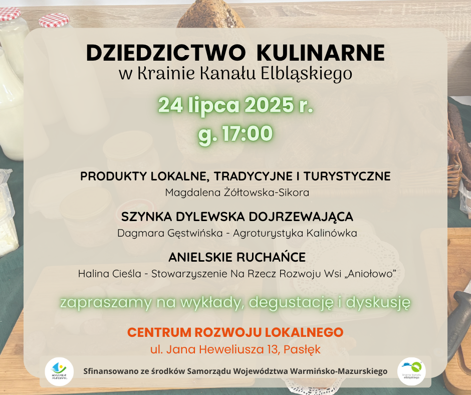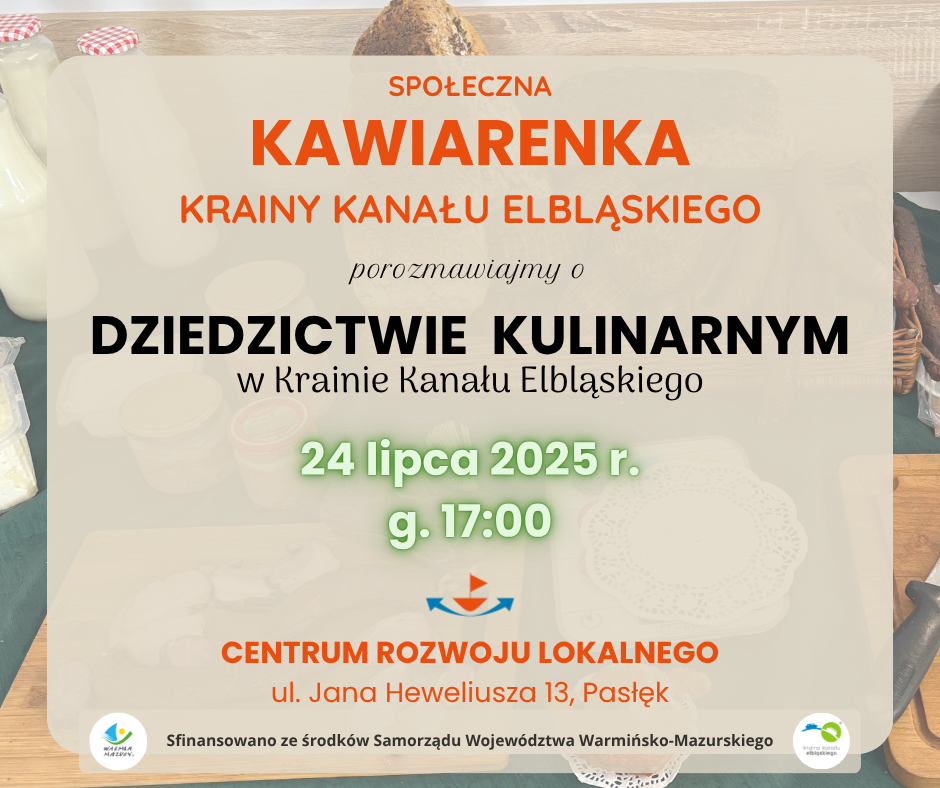 24 lipca 2025 r. w godz. 17:00–19:00 w Centrum Rozwoju Lokalnego w Pasłęku odbędzie się kolejna Kawiarenka Społeczna Krainy Kanału Elbląskiego, poświęcona właśnie dziedzictwu kulinarnemu i lokalnym smakom.